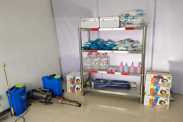 施工现场设置符合标准的隔离室及防疫物质储备库,储备了符合国家及行业标准的口罩、防护服、一次性手套、酒精、消毒液、手持喷壶、背负式喷雾器等防疫物质、确保达到施工现场一周的用量。