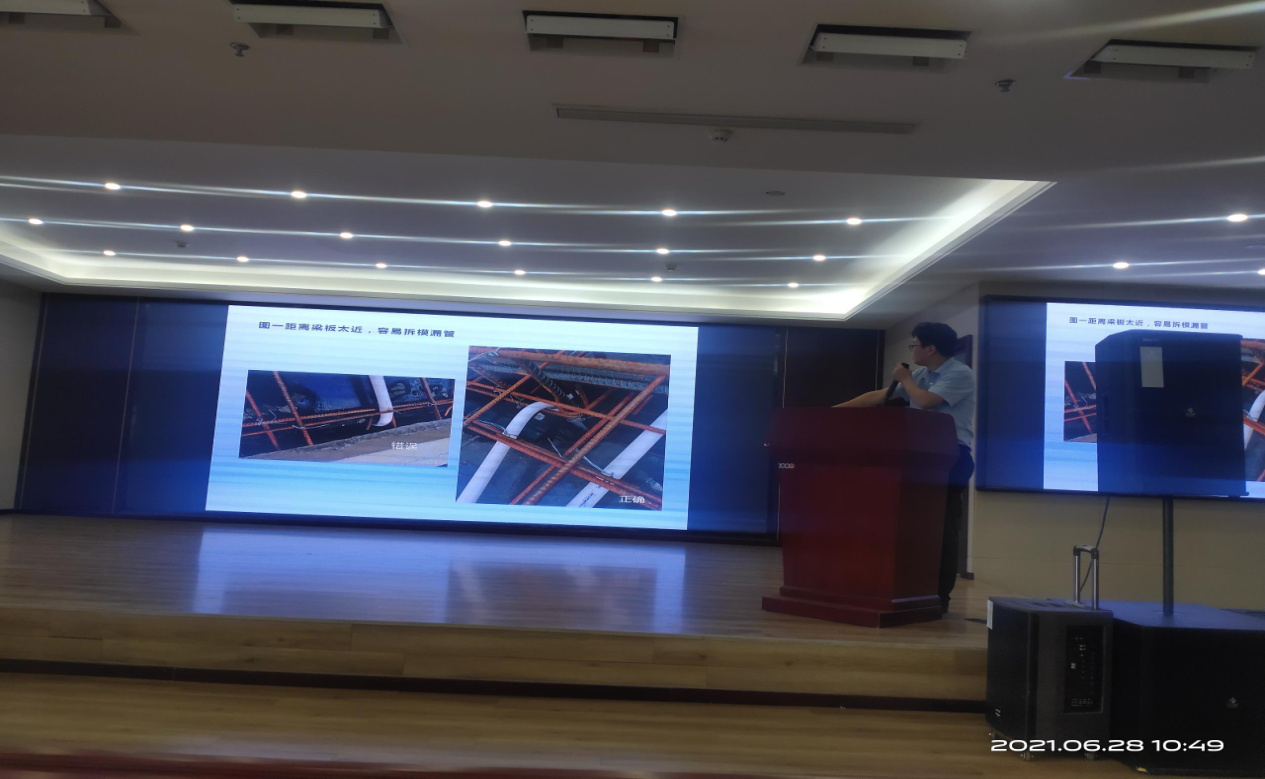 安装负责人胡松为大家讲解了安装工程质量管控,从防雷基础接地、安装预留预埋、给排水安装质量通病、防腐保温等进行了讲解,使各级管理人员和劳务队伍对目前施工的工程有了充分的认识和下一步的改进措施。